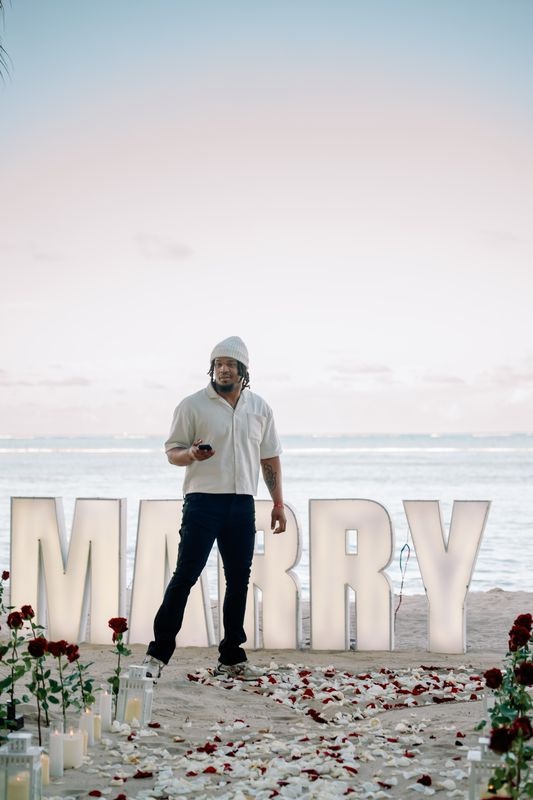 Demande en mariage sur la plage de Punta Cana avec lettres lumineuses MARRY ME