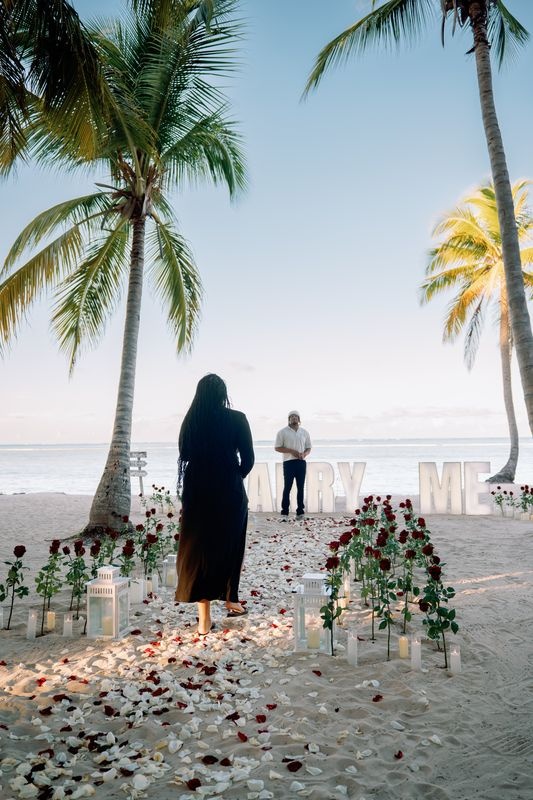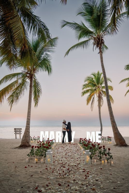 Une demande en mariage sur la plage de Punta Cana combine beauté naturelle, intimité et intensité émotionnelle. L’océan turquoise, le sable blanc et le coucher de soleil tropical créent un décor extraordinaire. De plus, les lettres lumineuses, les pétales de rose, les lanternes et les feux d’artifice transforment une simple question en une expérience cinématographique.