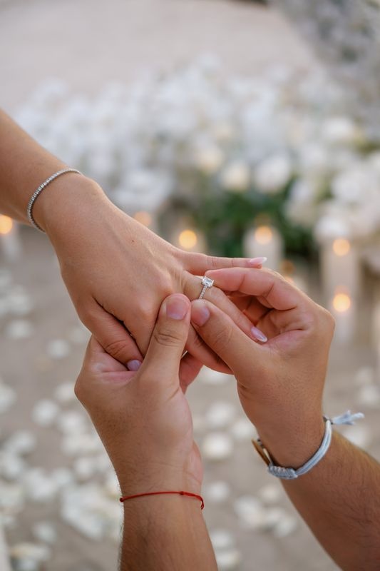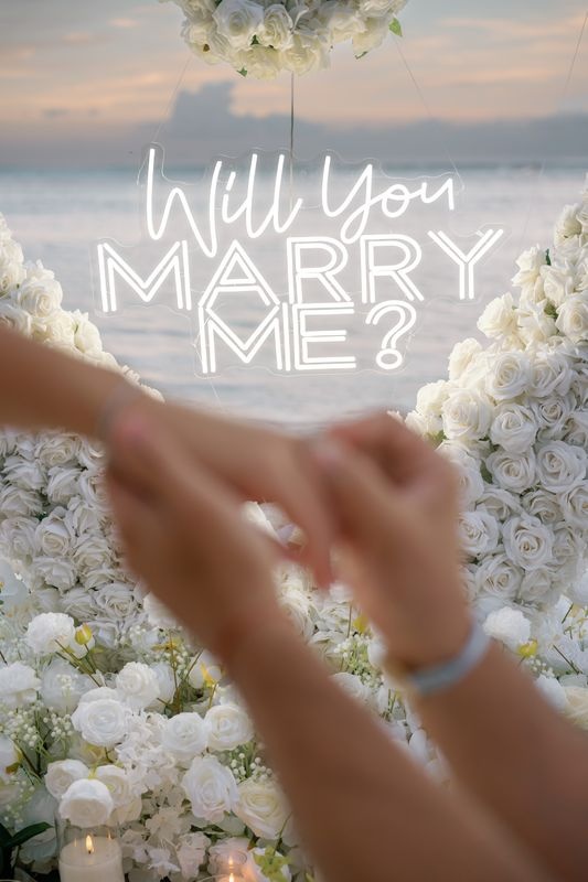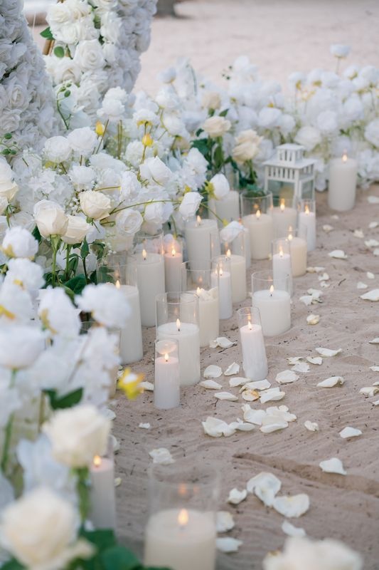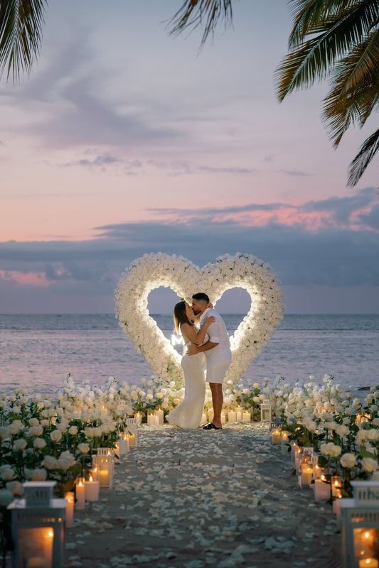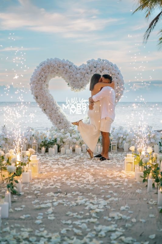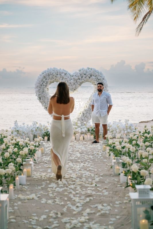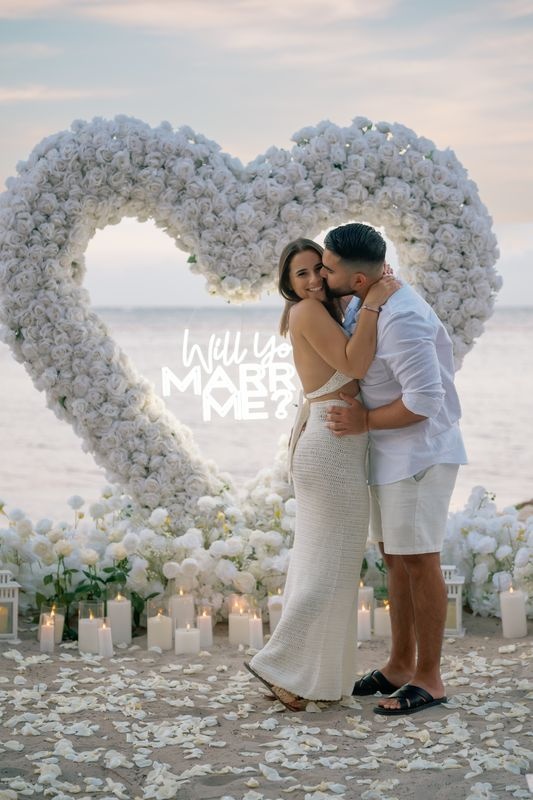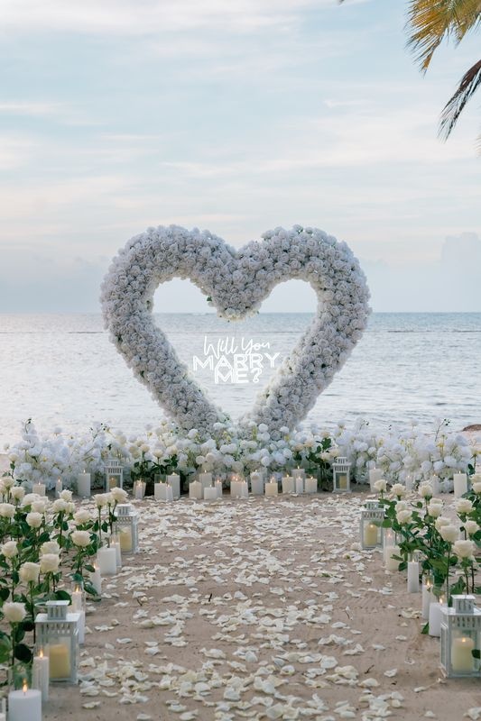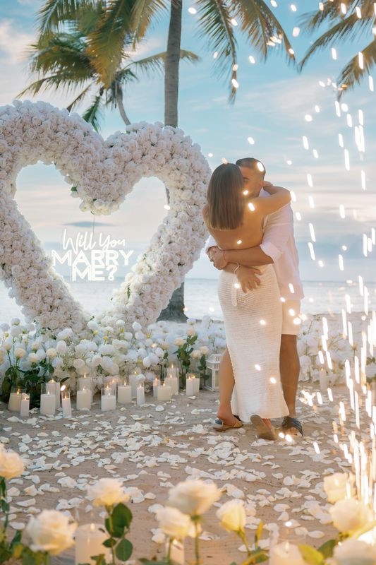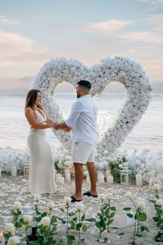 Cette demande a commencé avec un jeune couple arrivant sur une plage cachée. La future mariée pensait qu’il ne s’agissait que d’une simple promenade romantique. Mais en posant le pied sur le sable doux, elle a découvert une scène à couper le souffle. Un immense cœur de roses blanches se dressait dans le sable avec, en son centre, des mots lumineux : « VEUX-TU M’ÉPOUSER ? ». Un chemin de pétales de roses menait vers le cœur, encadré de bougies et de roses blanches élégantes disposées de chaque côté.