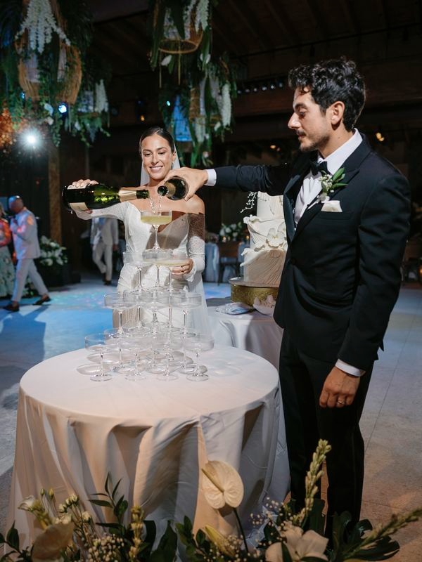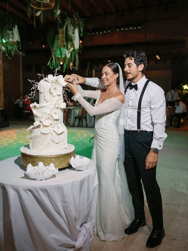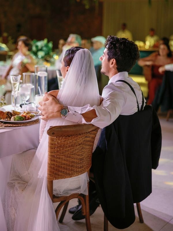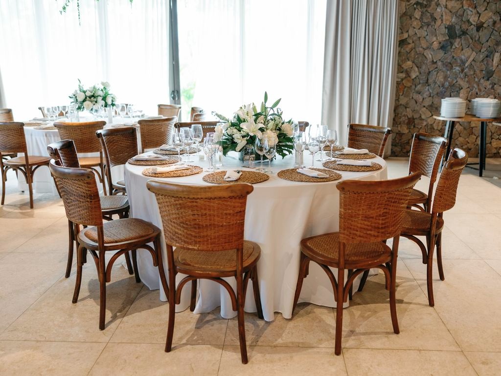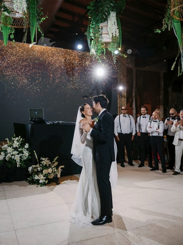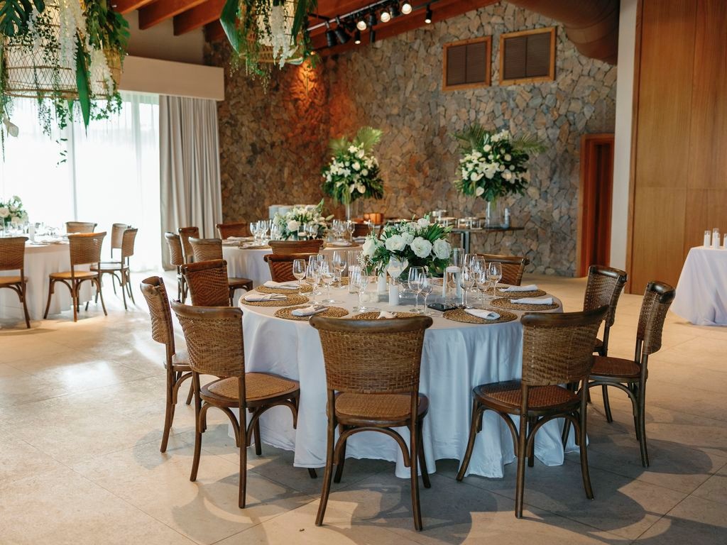Après les vœux, tous se sont rendus au charmant restaurant de Chez Bisutti Punta Cana pour la réception. La transition de la plage à la salle s’est faite en douceur. De plus, la décoration a immédiatement captivé l’attention. Les tables étaient ornées de compositions florales vertes et blanches. Ainsi, elles créaient une palette tropicale moderne, fraîche et raffinée. De plus, l’éclairage soigneusement installé et les détails personnalisés ont offert une atmosphère chaleureuse et intime.