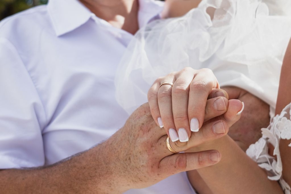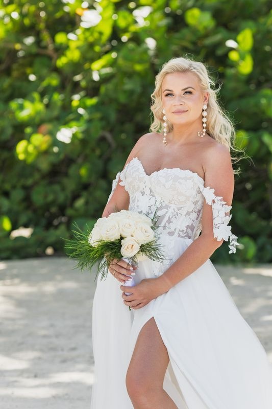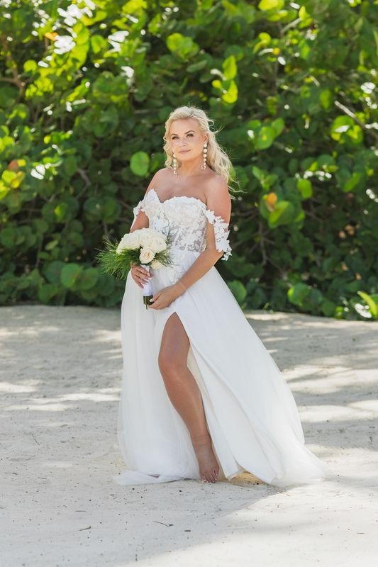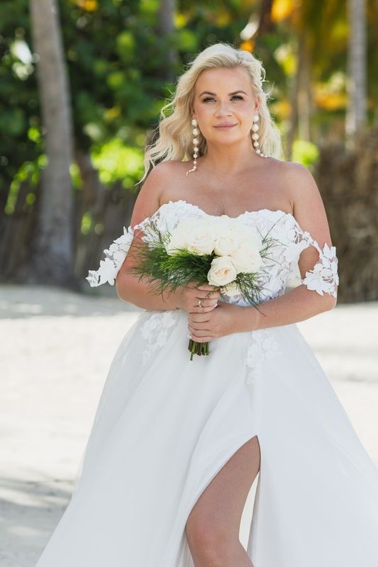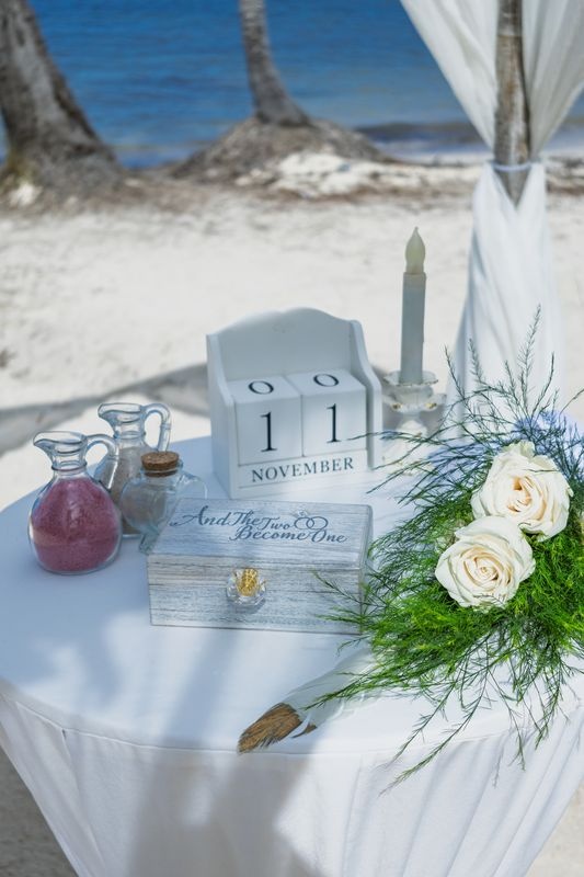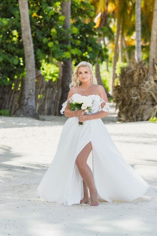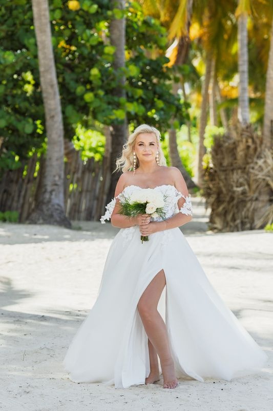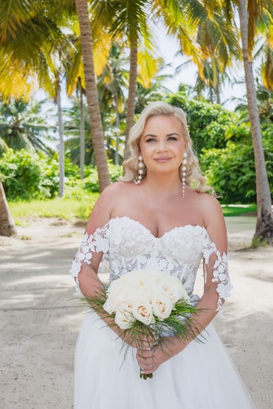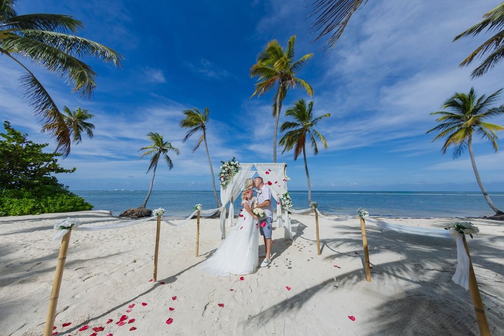 Mariage sur la plage à Punta Cana : le couple a célébré leur union sur le rivage avec leur fille de 1,5 an, une arche en bambou, des tissus blancs et des fleurs blanches. La mer turquoise, le sable blanc et doux et les palmiers luxuriants créaient une ambiance calme et joyeuse.